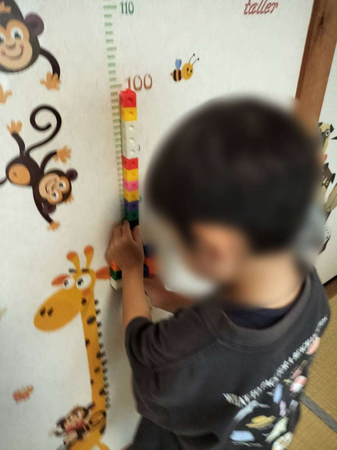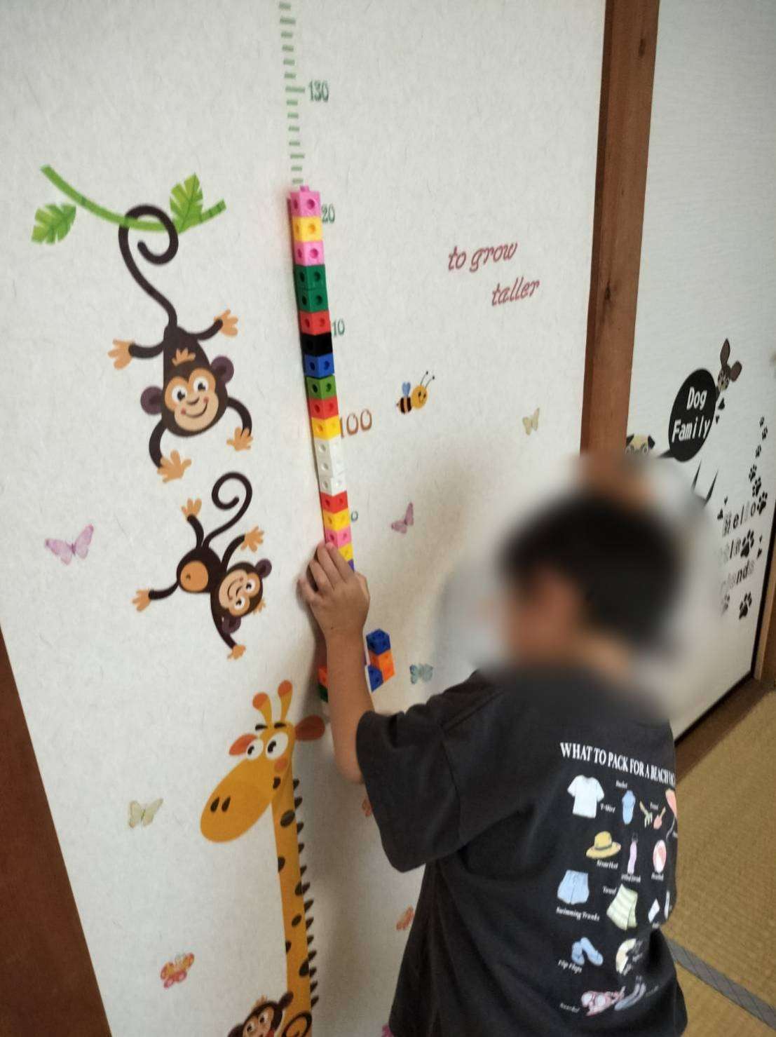 彼はその後、教室の壁にある身長計のディスプレイに気づき、作った剣と比べはじめました。「まだ短い!」と気づくと、ブロックを足して再挑戦!何度も試しながら、自分の目で確かめ、考え、改良を重ねていきました。そして完成したとき、誇らしげに「It’s a long sword!」と英語で表現。英語を「教えられた言葉」としてではなく、「自分の思いを伝える言葉」として使えた瞬間でした。